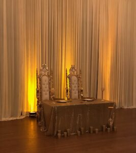 ivory velour pipe and draping for wedding los angeles with throne chairs